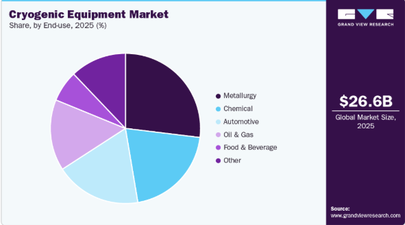 2025年時点で冶金セグメントは収益シェアの26.9%を占めた。冶金セグメントは極低温機器の最大消費分野の一つであり、その生産規模が極低温機器の持続的な需要を直接支えている。World Mining Data, 2025 によると、主要金属商品全体で継続的な拡大が見られ、製鋼、非鉄金属精錬、合金生産における活発な活動を反映しています。これらすべては、酸化制御、脱炭、不活性化、温度調節、炉効率向上のために大量の液体酸素、窒素、アルゴンを必要とします。