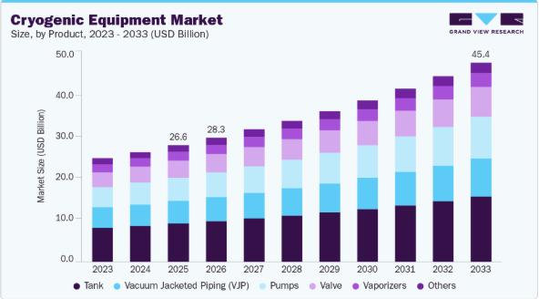ポンプセグメントは、2026年から2033年にかけて収益ベースで7.7%というかなりのCAGRで成長すると予測されています。LNG利用の増加、産業用ガス消費量の拡大、水素生産・輸出プロジェクトの強い勢いにより、ポンプセグメントは著しい成長が見込まれています。例えば、ニッキソ・クライオジェニック・インダストリーズは、高信頼性の極低温流体移送向けに設計された再ガス化用および水中モーターポンプを提供している。液化・再ガス化能力が世界的に拡大し、水素モビリティと燃料インフラが進化する中、新規プラント建設と既存プラント改修の両方で、堅牢な極低温ポンプシステムへの需要が増加し続けている。