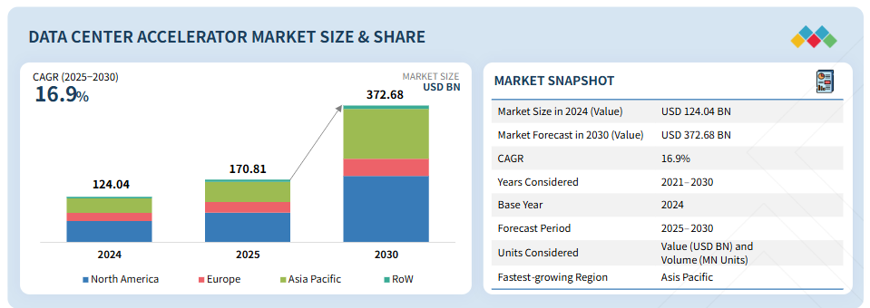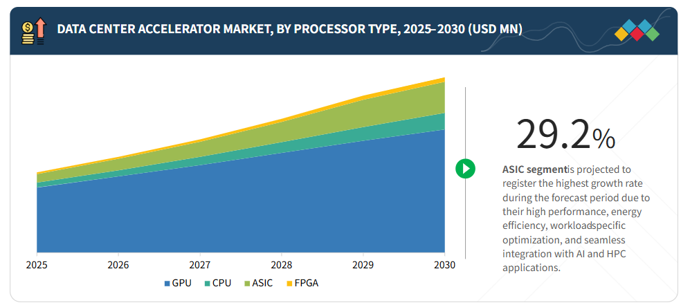 アジア太平洋地域は、クラウド導入の急速な進展、ハイパースケールデータセンターの拡張、AI駆動型ワークロードの増加を背景に、2025年から2030年にかけてデータセンターアクセラレータ市場で最も急速に成長するセグメントとなる見込みです。中国、インド、日本における強力な政府支援、5Gの展開、デジタルトランスフォーメーションの推進が、高度な高性能コンピューティングインフラへの需要をさらに加速させています。