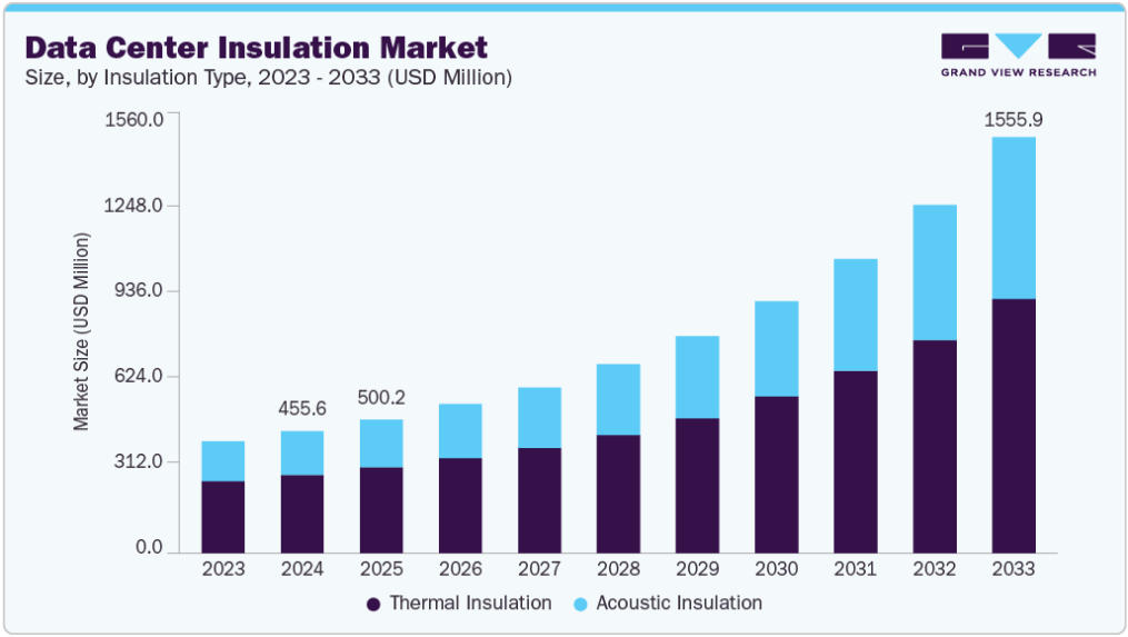 防音断熱材セグメントは予測期間中に大幅なCAGR(年平均成長率)を記録すると見込まれています。データセンターには高速サーバー、冷却ファン、HVACシステム、バックアップ発電機が設置されており、これら全てが大きな騒音を発生させます。高密度環境では、この騒音が作業スペースや外部環境に悪影響を及ぼすレベルのデシベルに達する可能性があります。防音断熱材は音を吸収・減衰させることでこれを緩和し、より静かで安全な施設環境を確保します。さらに、オフィスや都心部、住宅地近くに設置される都市型・エッジデータセンターの増加傾向により、効果的な騒音制御の必要性が高まっている。地域の騒音規制を遵守し近隣住民への迷惑を避けるため、運営者は新規建設・改修工事を問わず、標準設計要素として遮音材への投資を拡大している。