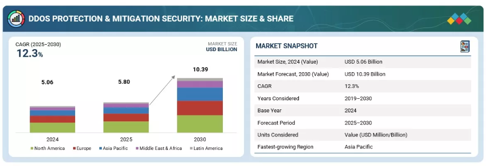 DDoS対策・緩和セキュリティ市場は、2024年の58億米ドルから2030年までに103億9,000万米ドルへと大幅に成長し、予測期間(2025年~2030年)において12.3%の高い年平均成長率(CAGR)を記録すると見込まれております。