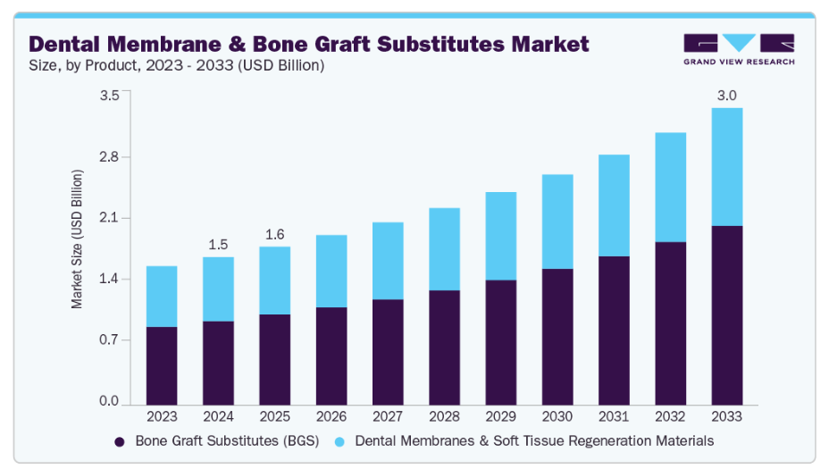 さらに、増加する歯科観光も市場成長を促進すると予想されます。歯周病、虫歯、歯の喪失、口腔がんを含む歯科疾患の世界的な有病率の上昇が、歯科用膜および骨移植代替材市場の需要を大きく牽引しています。2025年3月に発表された世界保健機関(WHO)のデータによると、世界中で10億人以上が重度の歯周病に苦しんでいます。さらに、20歳以上の成人の約7%、60歳以上の約23%が完全な歯の喪失を経験しており、多くの場合、インプラントや骨再生処置が必要となります。これらの統計は、歯科インプラントおよび骨再生処置の必要性が高まっていることを示しており、歯の喪失はしばしば顎骨の劣化を招き、インプラントの成功した統合を支えるために骨移植代用材や膜が必要となります。