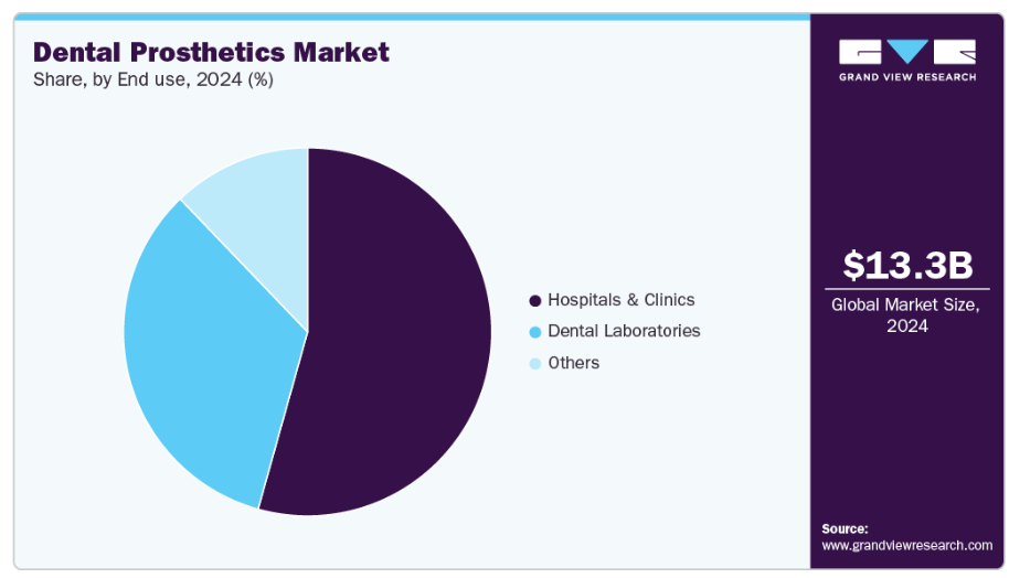 2024年において、病院・クリニックセグメントは歯科補綴業界で最大の収益シェア(54.3%)を占め、業界をリードしました。この優位性は、患者数の多さ、熟練した専門家の確保、先進的な設備の整備に起因しています。さらに、質の高い口腔ケアへの需要の高まりが、これらの施設における補綴処置を促進しています。加えて、高齢化人口の増加と口腔衛生意識の高まりも、セグメント成長を支えています。