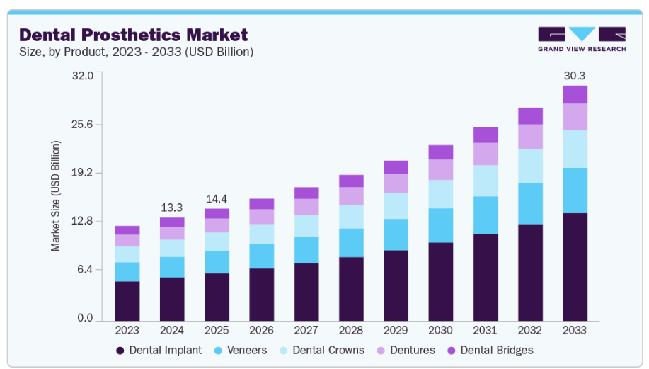 歯科補綴物市場は成長段階が高度であり、成長ペースは加速しています。新規製品の相次ぐ発売、審美歯科・美容歯科への需要増加、口腔疾患の負担増大により、市場は高い成長性を特徴としています。