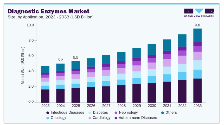 さらに、予防医療や疾病早期発見に対する患者の意識向上も、酵素ベースの診断検査需要を後押ししています。患者が自らの健康状態をより積極的に管理するようになり、心血管疾患、糖尿病、がんなどの疾患に対する酵素診断の利用が増加しています。このような予防医療管理への移行が、診断用酵素市場の成長をさらに加速させています。