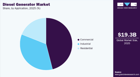 ディーゼル発電機は、予備電源、主電源、および連続電源用途において依然として広く使用されており、その耐久性、運用上の柔軟性、および費用対効果の高さから、中・大容量のユニットが好まれています。停電時に即座に電力を供給し、医療、製造、データセンター、建設などの分野における重要な業務を支える能力は、市場の成長をさらに後押ししています。米国、日本、インド、中国などの国々におけるインフラプロジェクトの継続的な拡大に加え、産業開発や電力供給の信頼性向上に向けた政府の支援的な投資が、世界的なディーゼル発電機の導入を後押しし続けています。
