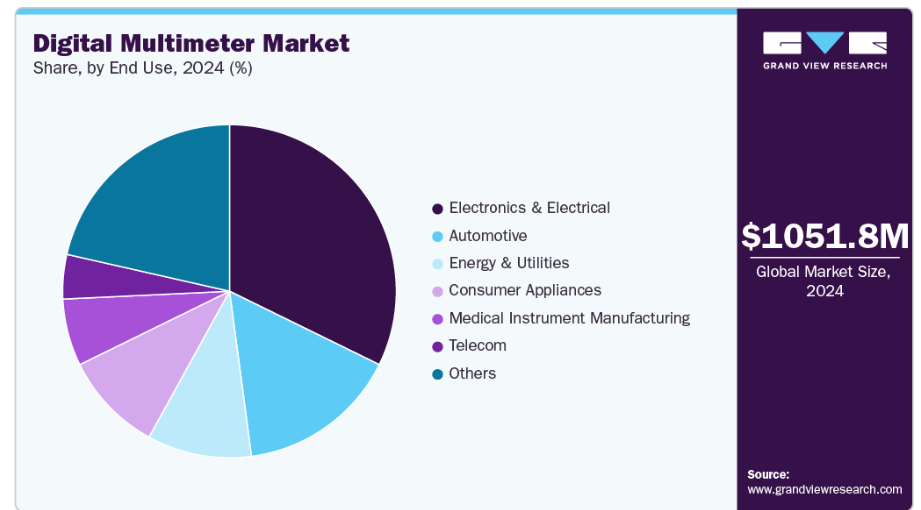 自動車セグメントは、2025年から2033年にかけて自動車関連収益において7.1%という高いCAGRで成長すると予測されています。電子・電気セグメントはデジタルマルチメータ産業を主導しており、2024年には32.2%のシェアを占めました。回路設計、製造、保守における精密な試験とトラブルシューティングの需要増加により、同セグメントは堅調な成長を見せています。民生用電子機器、半導体、IoTデバイスの急速な進歩が、正確な測定ツールの必要性を高めています。さらに、発展途上地域における電動化の拡大と電気インフラの継続的なアップグレードが、市場拡大を支えています。