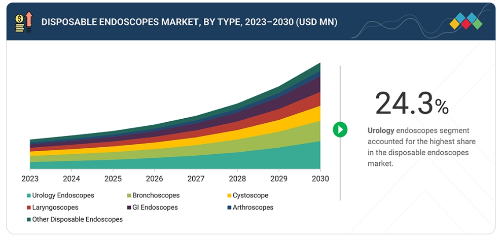 使い捨て内視鏡市場は、種類別に泌尿器科用内視鏡、気管支鏡、膀胱鏡、喉頭鏡、消化器内視鏡、関節鏡、その他の使い捨て内視鏡に分類されます。泌尿器科用内視鏡は、尿路疾患の高い有病率、腎結石の発生率上昇、および低侵襲手術の普及拡大により、最大の市場シェアを占めました。単回使用型尿管鏡は交差汚染リスクを低減し、高コストな再処理を不要とし、手技効率を向上させるため、世界中の病院や診療所で広く採用されています。