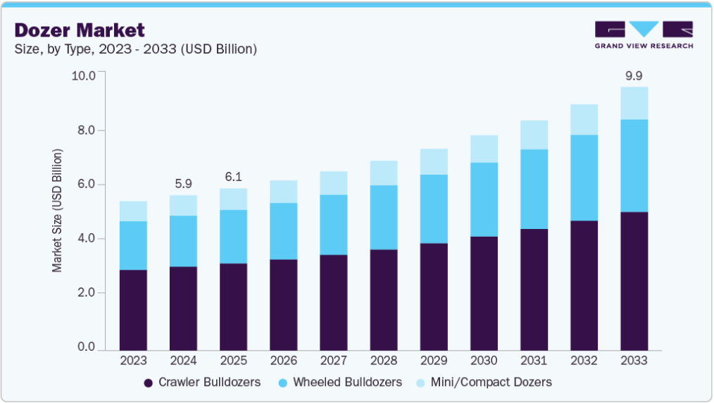 【英語タイトル】Dozer Market (2025 - 2033)Size, Share & Trends Analysis Report By Type (Crawler Bulldozers, Mini/Compact Dozers), By Engine Capacity (Up to 250 HP, 250 - 500 HP), By Propulsion (Electric, ICE), By End Use Industry, By Region, And Segment Forecasts