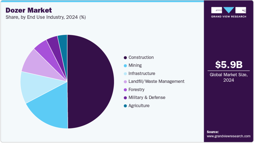 2024年において建設セグメントが最大の収益シェアを占めた。このセグメントは、先進国・新興市場を問わず住宅、工業団地、商業複合施設、公共施設の着実な拡大から恩恵を受けている。先進的なドーザー技術の採用は、建設現場における整地精度向上、手作業の削減、総合的な生産性向上に貢献している。