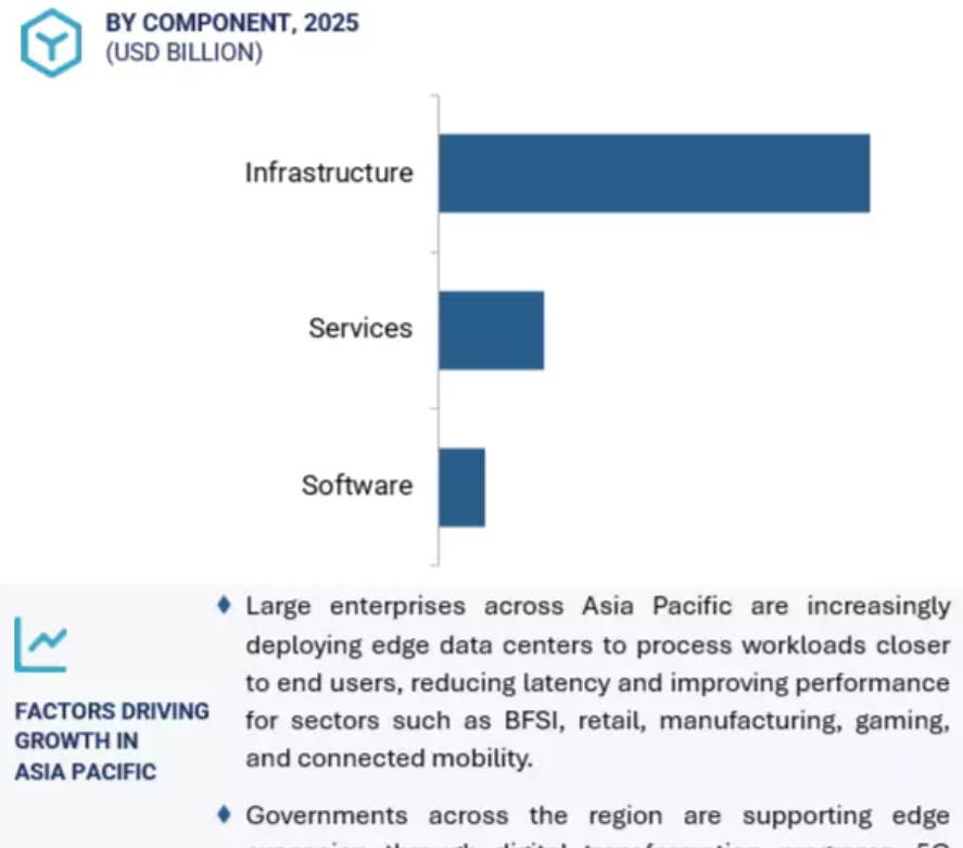 アジア太平洋地域は、中国、インド、日本における急速な通信網拡張、持続可能性への取り組み、ベンダーのイノベーションに牽引され、予測期間中のエッジデータセンター市場で最高CAGRを維持すると見込まれます。中国では、モバイル事業者が450万基以上の5G基地局を展開し、300都市で5G-Advancedが稼働中です。新たな2027年ロードマップでは、モバイルデータトラフィックの75%を5Gで処理することを目標としており、分散型コンピューティング容量への需要が急増しています。インフラ最適化のため、北京では国営の「余剰コンピューティング」取引所の設立が進められており、中国通信塔(China Tower)は210万のタワーサイトをAI、IoT、ドローン駆動型アプリケーションをサポートするインテリジェントエッジノードへ転換中です。インドでは、エッジ成長は持続可能性と資金調達に密接に関連しています。エアテル・ネクストラ社はエッジ施設を再生可能エネルギーへ移行し、運用コストとカーボンフットプリントを削減中です。一方、アダニコネックス社は全国的な分散型展開を加速するため、サステナビリティ連動型融資として14億4000万米ドルを確保しました。一方、日本では通信主導のエッジ技術革新が進展しています。NTTドコモとNTTコミュニケーションズは没入型XRや3Dレンダリング向けにマルチアクセスエッジコンピューティング(MEC)を展開し、KDDIはアジア最大級のAI特化型データセンターを計画中です。これらの進展により、アジア太平洋地域は拡張性・持続可能性・低遅延を最適化したエッジインフラの最速成長拠点として位置づけられています。