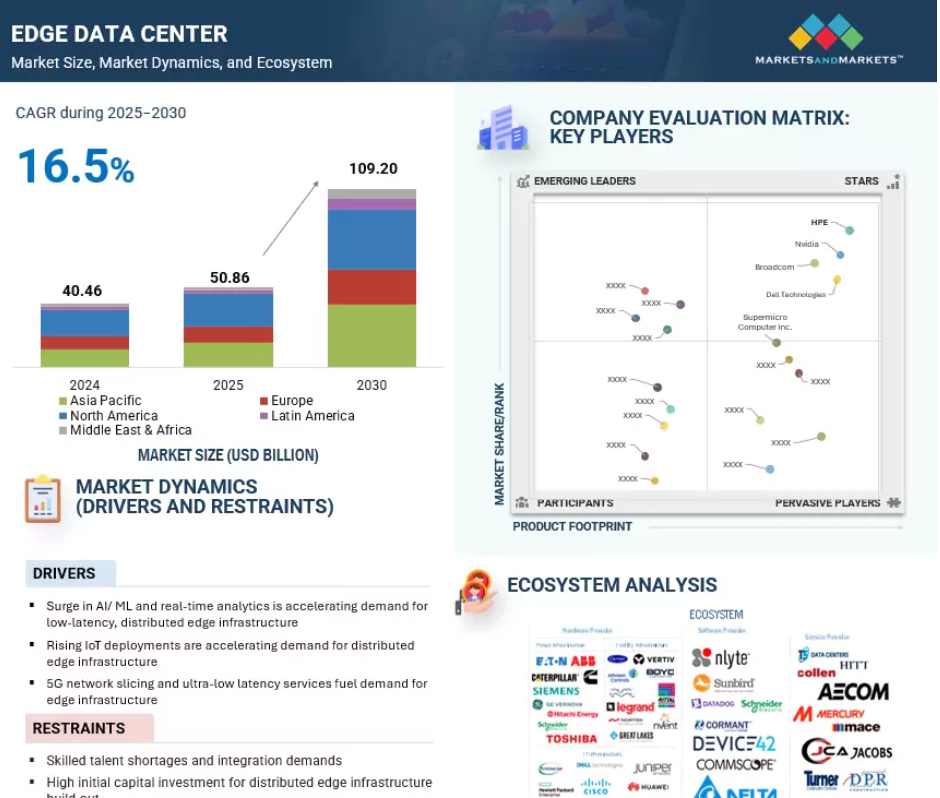 世界のエッジデータセンター市場は、2025年の508億6,000万米ドルから2030年までに1,092億米ドルへ成長し、予測期間中に年平均成長率(CAGR)16.5%を記録すると見込まれています。この勢いを背景に、経営陣の優先事項は、孤立したパイロットプロジェクトから、次世代ワークロードをサポート可能な大規模で分散型の環境へと移行しつつあります。投資判断を形作る3つの要因があります。