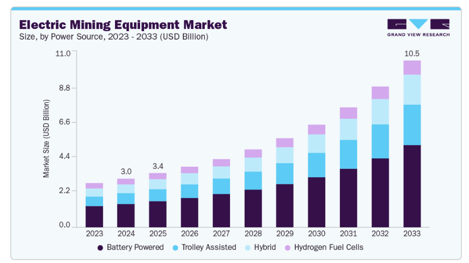 世界的な排出規制の強化が、電気式採掘機器セクターの市場成長を促進しております。欧州連合(EU)のグリーン・ディールや米国環境保護庁(EPA)のTier 4基準といった規制イニシアチブにより、採掘事業者はディーゼル駆動から電気駆動の車両群への移行を迫られております。米国エネルギー省(DOE)は、国家脱炭素化経路の一環として、スコープ1排出量削減における鉱業セクターの役割を強調しています。さらに、国際鉱業・金属評議会(ICMM)などの政府支援機関は、鉱業バリューチェーン全体でのネットゼロ達成を促すガイドラインを導入し、電気トラックやLHD(ロータリーハンドリングデバイス)などのゼロエミッション鉱山車両の需要を大幅に押し上げています。