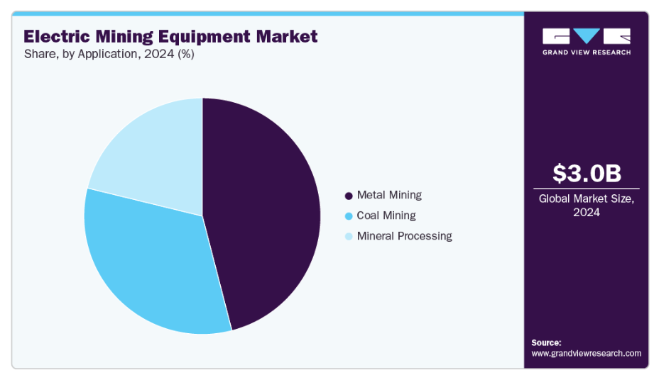 金属セグメントは2024年に市場を支配し、再生可能エネルギーおよび電気自動車産業の重要原料である銅、ニッケル、リチウムの需要増加により、予測期間中に著しいCAGRで成長すると見込まれています。米国、オーストラリア、EUの各国政府は、これらの戦略的鉱物の持続可能な調達を優先し、鉱山企業に対し「グリーン採掘」基準を満たすための電気機器導入を奨励しています。この規制強化と、倫理的なサプライチェーンを求める社会的圧力により、チリ、ペルー、オーストラリアなどの金属資源豊富な地域において、電気式採掘設備の導入が加速しています。