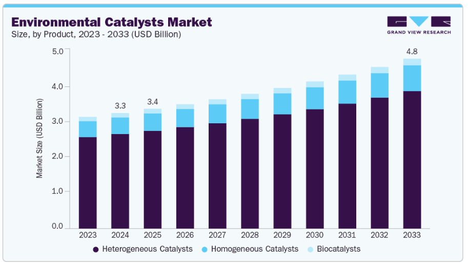 水・廃水処理セグメントは、2025年から2033年にかけて年平均成長率(CAGR)5.8%で最も急速な成長が見込まれています。産業や自治体は、従来の手段では完全に対処できない難分解性汚染物質、医薬品、染料、有機汚染物質を除去する圧力が高まっており、水・廃水処理セグメントは最も速い成長が期待されています。高度酸化プロセス、電気化学システム、光触媒反応器で使用される触媒は、より効率的な分解経路と化学薬品消費量の削減を実現します。分散型処理、ゼロ液体排出戦略、排出規制の厳格化への関心の高まりが、触媒技術の採用を促進しています。光触媒の安定性、電気触媒の効率性、反応器設計における継続的な進歩が商業的実現可能性を強化し、2033年までの急速な拡大を支えています。