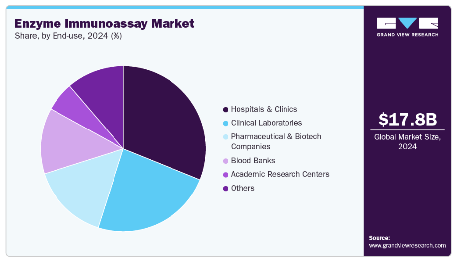 アプリケーション別では、2024年に感染症検査セグメントが最大の市場シェアを占めました。世界的に感染症の高い有病率と発生率が、効果的かつ効率的な診断手法の需要を牽引しています。EIA(酵素免疫測定法)はその感度と特異性から高い選好度を有しています。加えて、HIV、結核、マラリアなどの感染症対策に焦点を当てた公衆衛生イニシアチブやグローバルヘルスプログラムは、疾患負担のスクリーニングとモニタリングにEIAを含む血清学的検査に依存しています。酵素免疫測定法(EIA)は大量の検体を効率的に処理できる特性から、集団スクリーニングに最適であり、この応用分野での優位性に寄与しています。