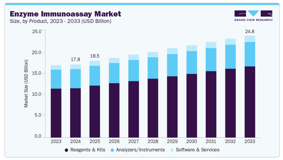 酵素免疫測定業界における高度な革新性は、科学研究、技術、規制枠組みの進歩に牽引され、酵素免疫測定の能力を向上させています。これらの進展により、酵素免疫測定の感度、特異性、効率性、実用性が大幅に向上し、臨床診断をはじめとする様々な分野での活用が促進されています。