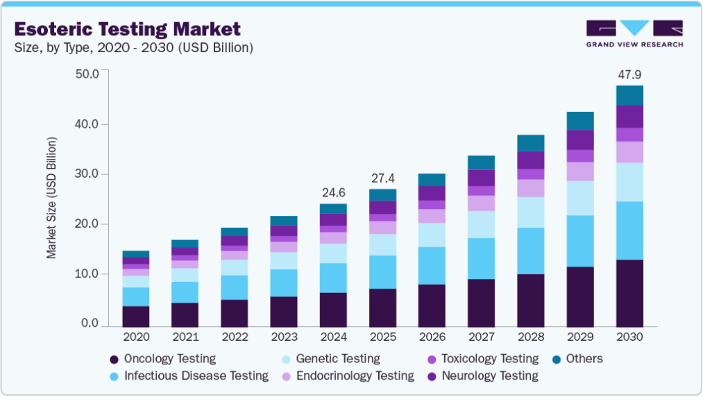 【英語タイトル】Esoteric Testing Market (2025 - 2030)Size, Share & Trends Analysis Report By Type (Oncology Testing, Infectious Disease Testing, Infectious Genetic Testing), By Technology, By End Use (Hospital-based Laboratories) By Region, And Segment Forecasts