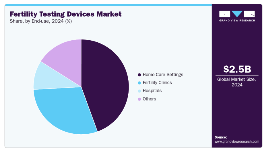 2024年には、便利で非侵襲的、かつプライベートな不妊モニタリングソリューションへの需要が高まったことから、在宅ケア環境セグメントが44.46%と最大のシェアを占めました。生殖健康に関する意識の高まりに加え、自宅で排卵周期、ホルモンレベル、精子の質を追跡したいという要望が、家庭用不妊検査デバイスの普及を促進しています。さらに、デバイスの精度向上、使いやすさの向上、デジタルヘルスプラットフォームとの連携が進んだことで、ユーザーの信頼性と関与が強化されました。加えて、インターネット普及率の上昇とeコマースの利便性により、これらのデバイスへのアクセスが拡大し、家庭での不妊ケアがますます現実的で好まれる選択肢となっています。