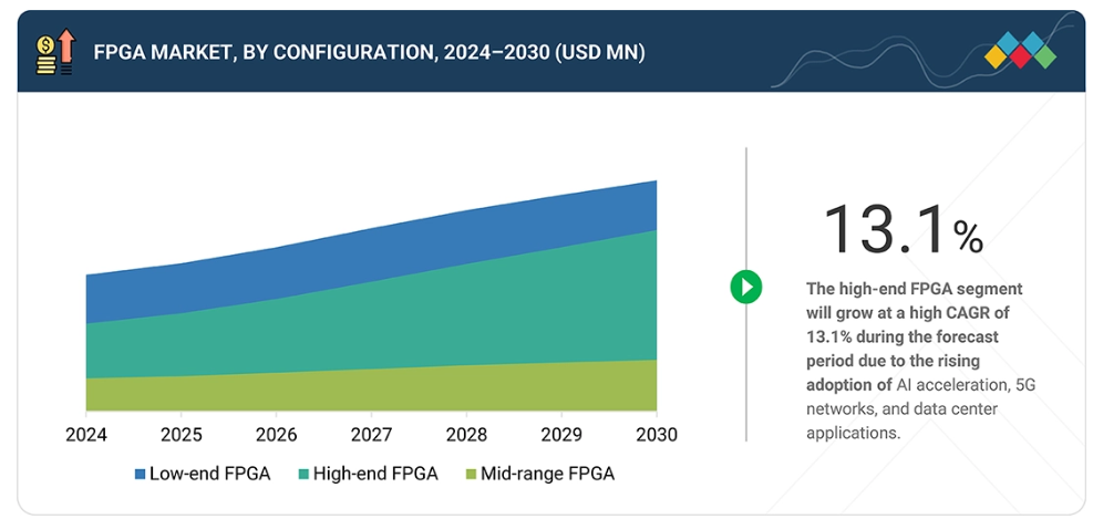 FPGA市場は、データセンター、通信、自動車アプリケーションにおける再構成可能かつ高性能なコンピューティング需要の増加に牽引され、力強い成長を遂げております。AIおよび機械学習ワークロードの普及と、急速な5Gネットワーク拡大が相まって、並列処理能力と低遅延性を備えたFPGAの採用が加速しております。さらに、システムオンチップ(SoC)FPGAや組み込みFPGA(eFPGA)の統合技術の進歩により、エッジコンピューティングやIoTデバイスにおけるユースケースが拡大しています。各産業が柔軟性、エネルギー効率、迅速なプロトタイピングを重視する中、FPGAは次世代インテリジェントハードウェアシステムの基盤技術として台頭しつつあります。