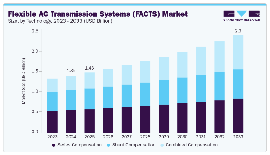 これらのシステムは、高価なインフラアップグレードを必要とせずに、動的電圧制御を可能にし、電力品質を改善し、既存の送電線の送電容量を向上させます。電力需要の増加、送電網の混雑問題、そして脱炭素化に向けた世界的な動きが、FACTSの導入をさらに促進しています。さらに、電圧源変換器(VSC)やスマートグリッド技術などのパワーエレクトロニクスの進歩により、システムの柔軟性が向上し、全体的な運用コストが削減されるため、FACTSは現代の電力ネットワークにとって不可欠なソリューションとして位置付けられています。