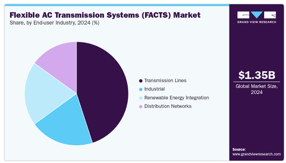 再生可能エネルギー統合セグメントは、予測期間中に最も高いCAGRで成長すると見込まれています。風力や太陽光などの再生可能エネルギー源を既存のグリッドに統合する動きが、送電システム全体における動的電力制御と無効電力補償の必要性を高めています。SVC(静止無効電力補償装置)やSTATCOM(静止同期補償装置)などのFACTS装置は、変動する電圧の安定化や負荷管理の強化に広く活用されています。さらに、進行中の送電網近代化プロジェクトや国境を越えた相互接続イニシアチブが、これらの技術の導入を促進しています。送電インフラのアップグレードと送電網効率の最適化への投資が増加する中、送電線サブセグメントは予測期間を通じてFACTS市場における主導的地位を維持すると見込まれます。