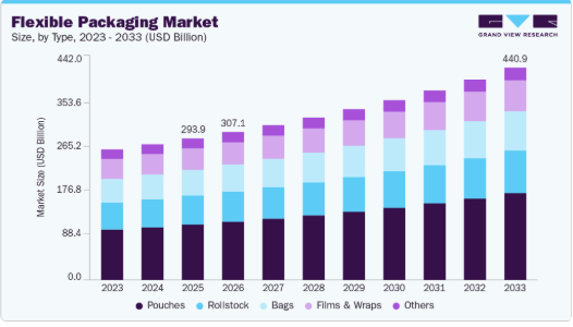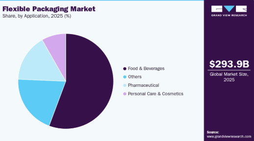 さらに、リサイクル可能な単一素材構造、薄肉化、硬質包装と比較したカーボンフットプリントの削減といった持続可能性のトレンドが、世界的な採用を加速させています。フレキシブル包装は、効果的なバリア性能、長期保存性、分量管理、そしてパウチ、サシェ、ラップなどの軽量フォーマットを提供します。これらの利点により、包装食品、スナック、乳製品、飲料、冷凍製品に非常に適しています。急速な都市化、可処分所得の増加、そして特に新興経済国における組織化された小売および電子商取引チャネルの拡大が、市場の需要を加速し続けています。