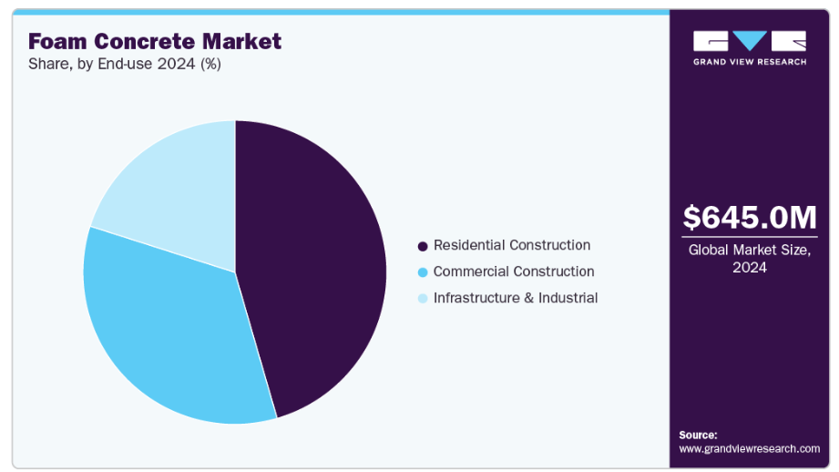 2024年時点で住宅建設セグメントが42.6%の最高収益シェアを占めました。これは住宅需要の増加、政府の低価格住宅政策、省エネ住宅推進が背景にあります。発泡コンクリートの軽量性、断熱性、遮音性は壁・屋根・床材として理想的です。発展途上国における低コスト住宅への採用が、同セグメントでの主導的地位をさらに強化しています。