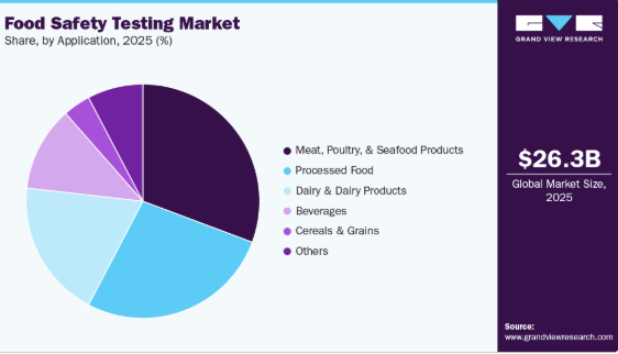 2025年には、微生物検査セグメントが市場を牽引し、世界の収益シェアの28.9%を占めました。微生物検査は、サルモネラ菌、大腸菌、リステリア菌などの病原体を検出する上で不可欠な役割を果たしているため、世界市場を牽引しています。これらの微生物は食中毒の一般的な原因であり、サプライチェーン全体での定期的なスクリーニングが不可欠です。規制当局は、コンプライアンスと公衆安全のために微生物学的分析を義務付けています。乳製品、肉類、加工食品におけるその広範な適用が、その優位性を強めています。