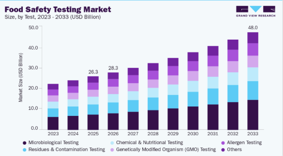 PCRベースのアッセイやバイオセンサーなどの検査技術における技術的進歩により、食品安全診断の速度と精度が向上しました。食品加工企業による迅速検査ツールの採用拡大は、コンプライアンスの確保と製品リコールの削減につながっています。さらに、HACCPやISO 22000などの安全基準の導入拡大が市場の成長を牽引しています。これらのイノベーションと規制枠組みが相まって、世界の食品安全検査業界を活性化させています。