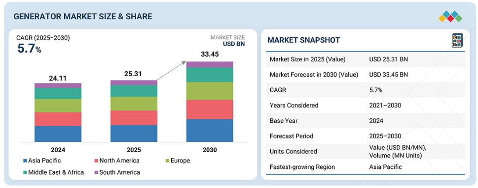 産業、商業、家庭用セクターにおける信頼性の高いバックアップ電源および主電源の需要の高まりにより、世界の発電機市場は着実な成長を続けています。主な推進要因としては、急速な工業化、製造業の拡大、頻繁な停電、インフラ開発、データセンターの台頭などが挙げられます。多様な燃料源(ディーゼル、ガス、再生可能エネルギー)、デジタル制御を備えたスマート発電機の採用、クリーンエネルギーと排出削減に関する規制の焦点が、技術動向を形作っています。アジア太平洋地域と北米は、製造業、データセンター、インフラプロジェクトからの強い需要により支配的ですが、持続可能性への取り組みと再生可能エネルギーの統合の拡大が、イノベーションと市場拡大を促進しています。