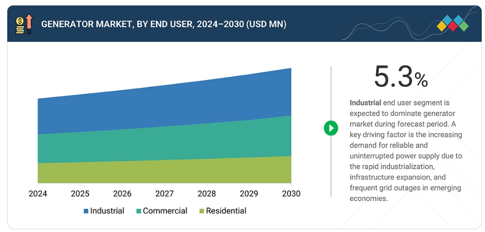 発電機市場は、途切れることのない信頼性の高い電力供給への需要増加、急速な工業化、製造業セクターの成長によって牽引されています。IT、通信、医療、ホスピタリティ、小売、公共インフラなど、複数の商業セグメントにおいても、事業継続性とリスク軽減を確保するためのバックアップ電源の重要性が認識されています。