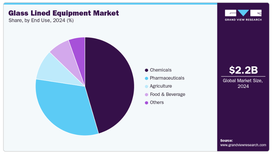 製品別では、反応器セグメントが市場をリードし、2024年の世界市場シェアの40.2%を占めました。反応器は現代のプロセスプラントにおける生産ラインの重要な構成要素であり、製薬、石油化学、農薬、軽工業、食品、染料、科学研究など、様々な産業で広く採用されています。化学および製薬産業では、化学的適合性からガラスライニング反応器が使用されています。