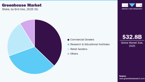 2025年時点で商業栽培セグメントが37.0%超の最大市場シェアを占めた。外食産業の拡大と機関需要が商業市場の成長を牽引している。レストラン、ホテル、ケータリングサービス、施設厨房は、顧客の期待に応えるため、新鮮で高品質な農産物の安定供給を必要としています。温室栽培により、商業生産者はこれらのセクターに特化した特殊作物、ハーブ、季節外れの野菜を供給できます。作物品種のカスタマイズと確実な納品スケジュールの確保が可能であるため、温室は外食産業市場をターゲットとする商業生産者にとって最適な投資となっています。この高まる施設需要が、世界中の商業用温室施設の拡大と近代化を促進しています。
