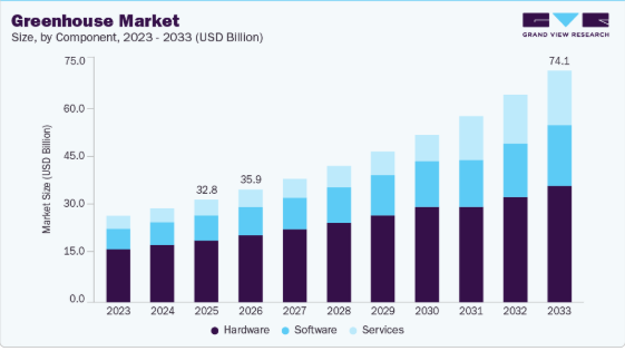 世界人口の増加と、都市化・気候変動・土壌劣化による耕作地の減少に伴い、温室栽培は従来の露地栽培に代わる効率的な選択肢を提供します。温室は通年栽培を可能にし、作物を極端な気象条件から保護し、温度、湿度、光などの要素をより適切に制御できます。この制御された環境は、作物の収量向上、水使用量の削減、収穫量の予測可能性向上につながり、温室ソリューションは、食糧安全保障に投資する商業生産者や政府にとって特に魅力的なものとなっています。