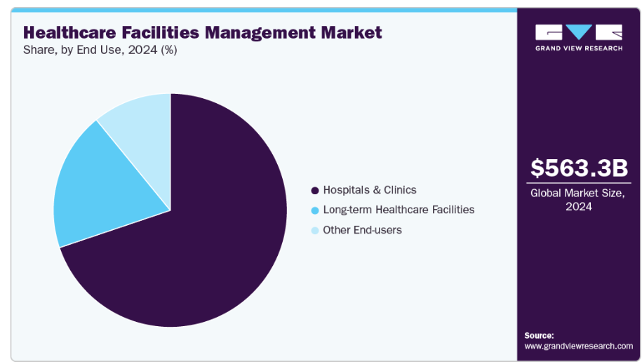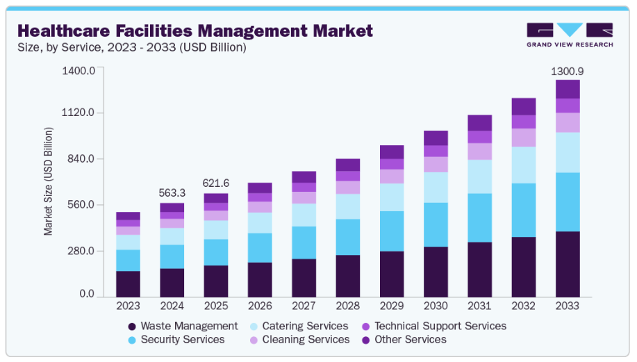 施設管理の革新は、業務効率、安全性、患者体験全体の向上を通じて、市場の成長に重要な役割を果たしています。現代の医療現場では、照明、空調システム、エネルギー使用量、設備メンテナンスをリアルタイムで監視・管理するため、スマートビル技術、IoTデバイス、自動化がますます活用されています。これらの進歩は、運営コストの削減、リソース配分の改善、厳格な医療規制へのコンプライアンス維持に貢献します。2025年8月、富士通は医療管理向けAIプラットフォームを開発しました。このプラットフォームは、業務の自動化、リソース配分の最適化、病院管理者向けの意思決定支援を通じて業務効率を向上させます。リアルタイムデータの分析により、一貫した医療サービスの提供を確保し、遅延を削減し、人的ミスを最小限に抑えます。患者流入の予測、スタッフのスケジュール管理、機器の性能監視を行い、最終的に患者ケアと施設の安全性を向上させるとともに、医療分野における先進技術の採用を促進します。