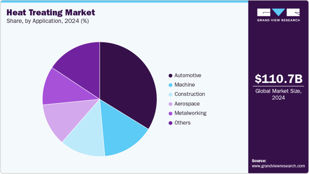 鋼材セグメントが市場を牽引し、2024年には79.9%の収益シェアを占めた。この優位性は主に、建設、自動車、重機械などの主要業界における熱処理鋼部品の需要増加に起因する。米国、中国、インドなどの国々ではインフラ開発が急拡大しており、これが高強度・耐摩耗性鋼部品の需要を促進している。熱処理は、強度、表面硬度、耐摩耗性、機械加工性など鋼材の機械的特性を向上させる上で不可欠である。これらの利点により鋼材は業界で最も広く熱処理される材料となっており、下流セクターからの継続的な需要が予測期間中にこのセグメントの成長をさらに推進すると見込まれる。