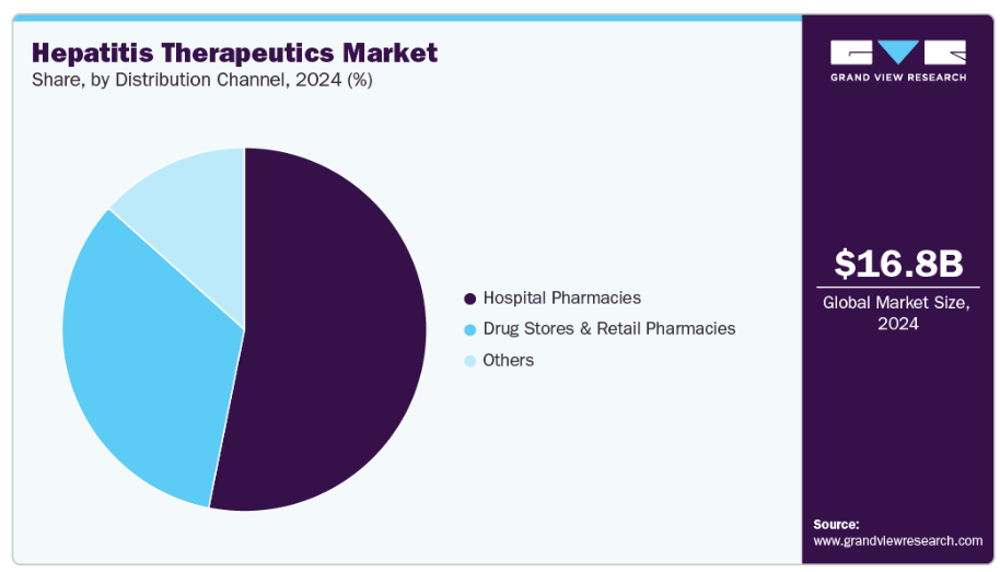 2024年には、専門医主導の処方と複雑な治療プロトコルの普及により、病院薬局セグメントが53.15%という最大の収益シェアを占めました。肝炎治療には肝機能検査やウイルス量評価など慎重なモニタリングが頻繁に必要であり、これらは通常病院環境で実施されます。DAA(直接作用型抗ウイルス薬)や生物学的製剤などの高コストなブランド治療薬は、管理された調剤を確保するため、病院ネットワークを通じて流通されることが多くあります。進行した肝疾患や併存疾患を有する患者様は病院での治療を受ける可能性が高く、これにより薬局売上高の増加が促進されます。病院薬局はメーカーとの強固な関係を維持しており、新規治療薬を小売店より早期に導入できます。機関向け購入契約も、交渉済み価格での大量供給を保証することで病院チャネルを優遇します。このチャネルの優位性は、先進的な肝炎治療提供における中核的役割を反映しています。