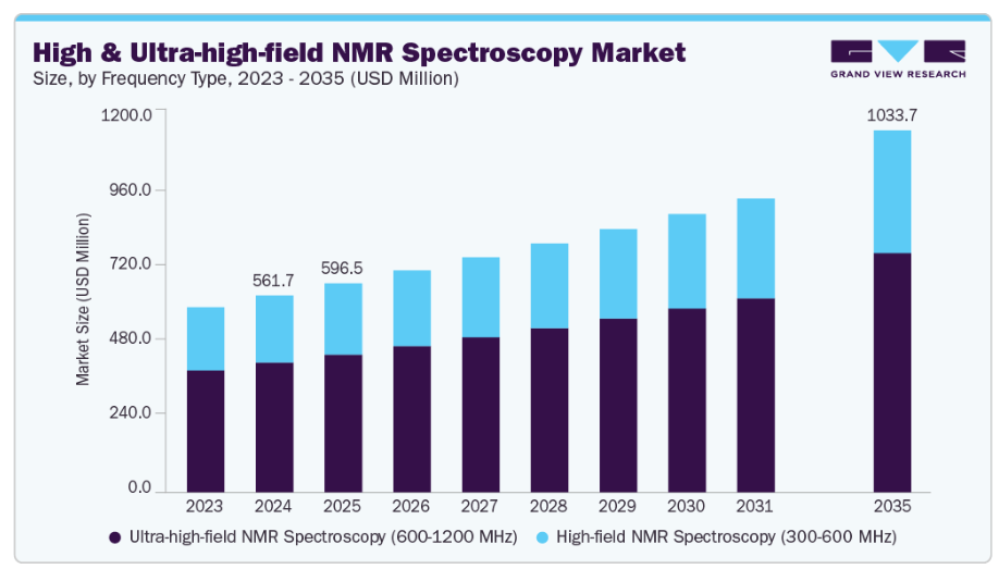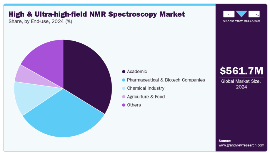 超高磁場NMR分光法(600-1200 MHz)セグメントは、その高度な技術能力と様々な科学分野における応用拡大により、2024年に市場をリードし、世界収益の65.96%を占めました。この周波数帯域は、詳細な分子・構造解析に不可欠であり、医薬品研究、材料科学、学術研究において必須の役割を果たしています。製薬業界は本セグメントの主要な推進要因です。創薬プロセスが複雑化するにつれ、タンパク質や核酸などの大型生体分子の詳細な構造解明の必要性が高まっています。600~1.2 GHz帯域のNMRは、これらの複雑な分子を研究するために必要な詳細性、分解能、感度データを提供します。この能力は、薬物標的相互作用の理解、リード化合物の最適化、生物学的製剤の構造的完全性の確保に不可欠です。