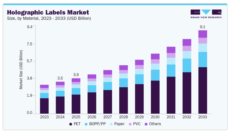 拡大するeコマースおよびオンライン小売も、ホログラフィックラベルの需要を後押ししています。消費者へ直接配送される製品量が増加する中、安全な包装ソリューションの必要性はより切実なものとなっています。ホログラフィックラベルは改ざん防止シールとして機能し、お客様が受け取る製品が本物で未開封であることを保証します。例えば、eコマースプラットフォームを通じて販売する電子機器メーカーは、輸送中の製品すり替えを防ぐため、包装にホログラフィックシールを頻繁に使用しています。さらに、インドや中国などの市場では、政府がサプライチェーンの安全性を強化する政策を導入しており、国内および国際貿易におけるホログラフィックラベルの普及を促進しています。