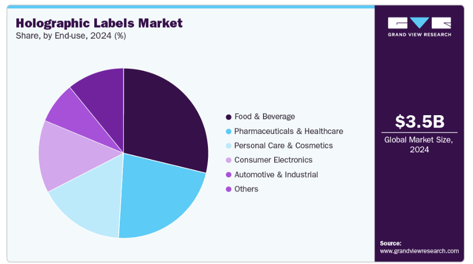 2024年において、食品・飲料セグメントは28.0%を超える最大の市場シェアを記録しました。牛乳、フレーバーミルク、ヨーグルトドリンク、クリームなどの液体乳製品が、ホログラフィックラベルの主要な最終用途カテゴリーです。これらの製品は、無菌包装またはゲーブルトップカートンで包装されることが多く、冷蔵不要で長期保存が可能であり、栄養成分を保持します。アムル、ラクタリス、ネスレなどの主要ブランドは、常温および冷蔵乳製品の流通においてカートン包装を多用しています。先進国・新興国双方における安全で保存性の高い乳製品への需要増加が、このセグメントを牽引しています。