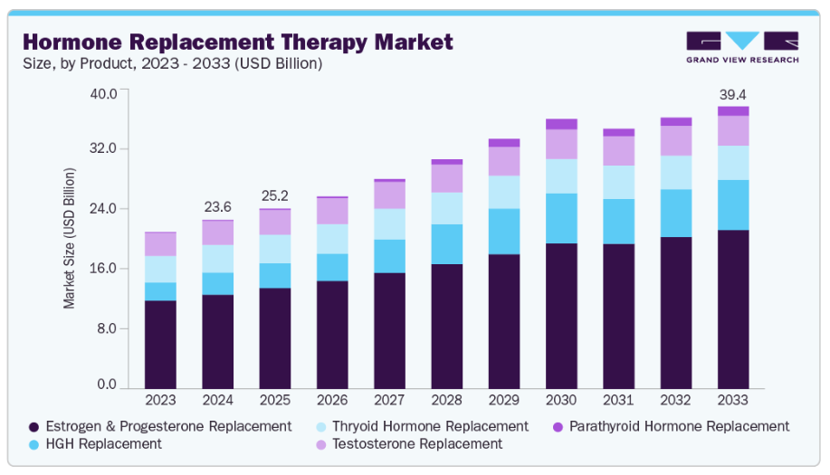 ほてり、寝汗、膣の乾燥、骨粗鬆症などの更年期障害に関連する症状が、効果的な治療法への需要を後押ししています。例えば、2024年10月にStatPearls Publishingが報告した内容によりますと、HRT(ホルモン補充療法)は中等度から重度の血管運動症状の管理に用いられており、875名の女性を対象とした「閉経後エストロゲン/プロゲスチン介入試験」では、エストロゲン単独群(オッズ比0.42; 95% CI, 0.28-0.62) およびエストロゲン+プロゲスチン併用群(オッズ比0.38;95% CI, 0.25-0.58)においてプラセボ群と比較して有意な症状軽減が認められました。本研究は、慢性疾患予防におけるHRTの役割は限定的である一方、症状緩和における重要性を明らかにしました。男性性腺機能低下症への認識の高まりと平均寿命の延伸が相まって、市場での採用をさらに拡大しています。