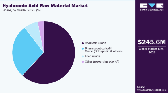 化粧品グレードセグメントはヒアルロン酸原料市場を支配し、2025年には収益シェアの61.91%を占めました。これは、保湿効果と肌質改善効果に対する消費者の強い需要に後押しされ、化粧品グレードのヒアルロン酸がクリーム、美容液、保湿剤などのスキンケア製品の主要成分であり続けているためです。国際美容形成外科学会によれば、2023年に世界で実施された美容施術は約3,490万件に上り、外用HAへの継続的な需要を支えている。ジボダン・アクティブビューティーが2024年に「PrimalHyal 50 Life」、2025年に「PrimalHyal UltraReverse」を発売したような製品革新は、持続可能な低分子量HAを用いた標的外用デリバリーへの注力を示している。臨床研究はさらに、ヒアルロン酸が保湿効果の向上、肌質改善、小じわの軽減に有効であることを裏付け、パーソナルケア産業における地位を確固たるものにしている。