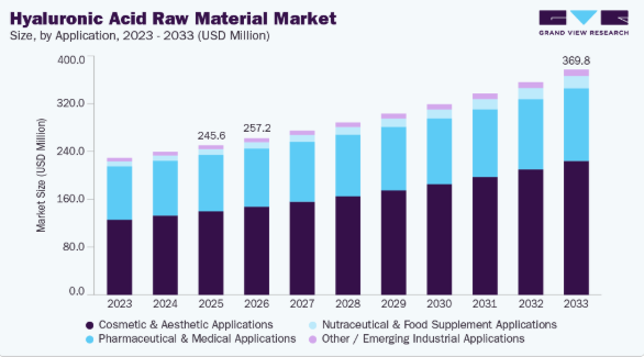 世界的なヒアルロン酸原料産業は、主に美容治療と皮膚充填剤への需要増加に牽引され、著しい成長を遂げています。米国美容形成外科学会の報告書によると、2024年3月時点で非外科的美容施術件数は増加しており、この成長の大きな割合を皮膚充填剤が占めています。