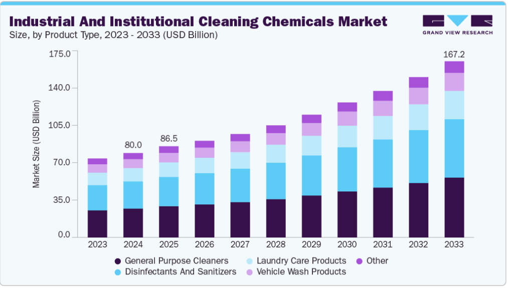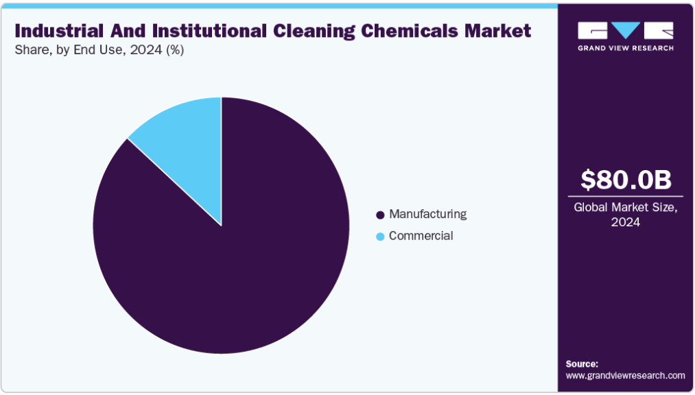 2024年、製造セグメントは86.95%という最大の収益シェアで市場をリードした。この拡大は、設備効率の維持、労働者の安全確保、厳格な規制基準への適合のために、同セクターが専門的な洗浄剤を継続的に必要としていることに起因する。自動車、電子機器、食品加工、重機械などの産業は、脱脂、精密洗浄、生産エリアの除菌のために高度な洗浄化学薬品に依存している。新興経済国における工業生産の拡大と、自動化・高性能製造ラインへの投資増加が相まって、効果的で環境に優しい洗浄ソリューションへの需要が高まっています。持続可能性が重要な焦点となる中、低VOC(揮発性有機化合物)および生分解性配合の革新がこのセグメントの堅調な成長軌道をさらに支えています。