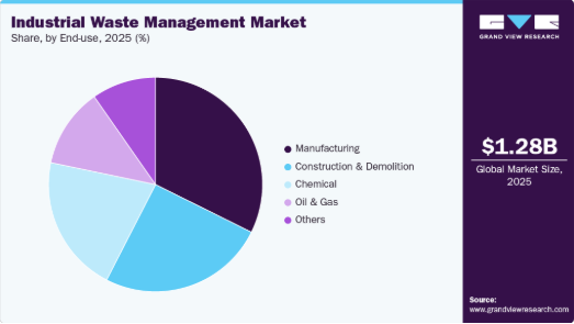 化学セグメントは、2026年から2033年にかけて収益ベースで6.4%という最も高いCAGR(年平均成長率)で成長すると予測されています。製造業は産業廃棄物管理市場を支配しており、大規模な生産プロセスと固形・液体・準危険廃棄物の継続的な発生により、2025年には32.3%のシェアを占めています。自動車、金属加工、食品加工、電子機器などの産業では、操業効率を維持するため、一貫した廃棄物収集・処理が必要です。高い生産量と厳格なコンプライアンス要件により、専門的な廃棄物管理サービスへの依存度が高まっています。この持続的な需要が、製造業を市場収益の主要な貢献者として位置づけています。