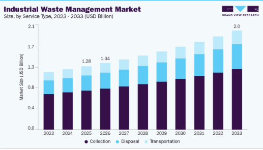 処分セグメントは、2026年から2033年にかけて収益ベースで6.4%という最も高いCAGRで成長すると予測されます。収集セグメントは産業廃棄物管理市場を支配し、2025年には61.6%のシェアを占めています。これは製造・加工施設からの廃棄物発生が継続しているためです。業界は、業務効率の維持と環境基準への準拠のために、信頼性が高く頻繁な廃棄物収集を優先しています。発生源における有害廃棄物と非有害廃棄物の安全な取り扱いニーズが、専門的な収集サービスへの需要をさらに強化しています。高度な物流計画と定期収集システムも、このセグメントの優位性を高めています。