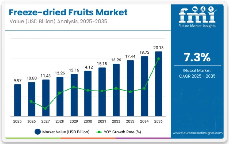 世界のフリーズドライフルーツ市場:フリーズドライフルーツ市場は、2025年の99億7,000万米ドルから2035年までに201億8,000万米ドルへ成長し、年平均成長率(CAGR)7.3%を記録すると予測