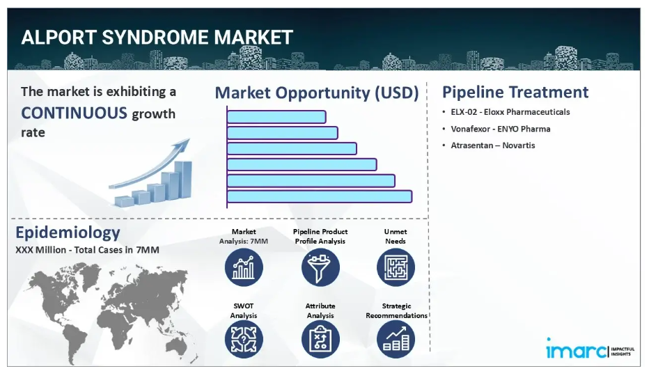 アルポート症候群市場を主に牽引しているのは、IV型コラーゲン遺伝子変異症例の増加です。この変異は腎臓、耳、眼などの様々な組織の基底膜に損傷を引き起こします。さらに、血圧降下や尿中タンパク質レベル低減を目的としたアンジオテンシン変換酵素阻害薬やアンジオテンシンII受容体拮抗薬など、複数の薬剤の普及が、もう一つの重要な成長促進要因として作用しています。加えて、多くの政府機関が希少疾患の研究および医薬品開発活動に対し、疾患の理解深化と効果的な治療法確立を目的とした大規模な投資を通じて支援を行っております。これにより、市場の成長がさらに促進されております。さらに、アルポート症候群の患者様が症状を管理し生活の質を向上させるための補聴器や視力矯正といった補助療法への需要が高まっていることも、市場にとって前向きな見通しを生み出しております。これに加え、疾患関連遺伝子における大規模欠失や重複を検出可能な多重リゲーション依存プローブ増幅法(MLPA)の導入など、診断分野における継続的な進歩が、今後数年間でアルポート症候群市場を牽引すると予想されます。
