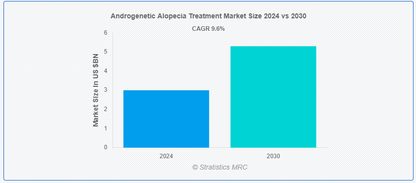 Stratistics MRCによると、男性型脱毛症治療の世界市場は2024年に30億ドルを占め、予測期間中の年平均成長率は9.6%で、2030年には53億ドルに達する見込みである。 男性型脱毛症治療は、遺伝的およびホルモン的要因によって引き起こされる脱毛を管理することを目的としており、主に男性および女性が罹患している。 ミノキシジルやフィナステリドのような、発毛を促進し、それ以上の脱毛を防ぐ薬剤を含む、様々なアプローチがあります。 また、健康な毛包をハゲている部分に移植する自毛植毛手術のような外科的オプションも一般的です。 さらに、ストレスの軽減やバランスの取れた食事などの生活習慣の改善も、男性型脱毛症により総合的な効果をもたらす治療法です。